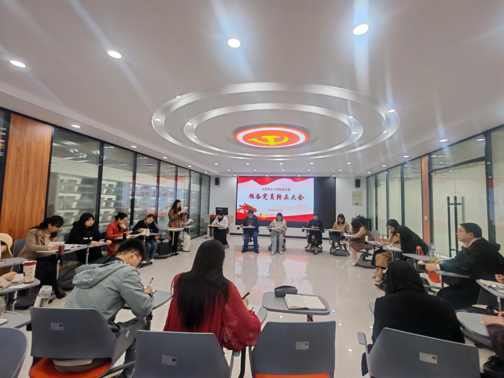 4月15日上午,beat365中国官网党支部在蟠龙校区图书馆二楼思政课虚拟仿真教学中心召开预备党员转正大会,讨论黄珍妮、杨洋两名预备党员转正事宜。会议由党支部负责人王康主持,党支部全体党员参加。