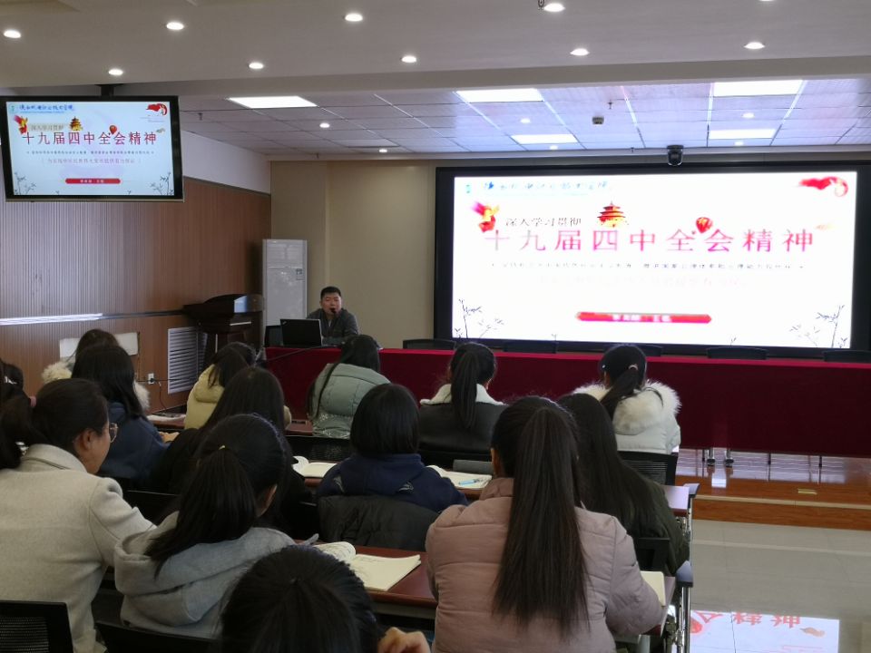 思政部部长王枢为同学们做了“深入学习贯彻十九届四中全会精神”的专题讲座,精准解读了十九届四中全会的主要精神,尤其是对“十三个坚持”的制度优势进行了深入浅出地讲解,切实提高了同学们的思想理论水平,为老员工自觉承担时代使命,共同助力中国梦的实现奠定了基础。