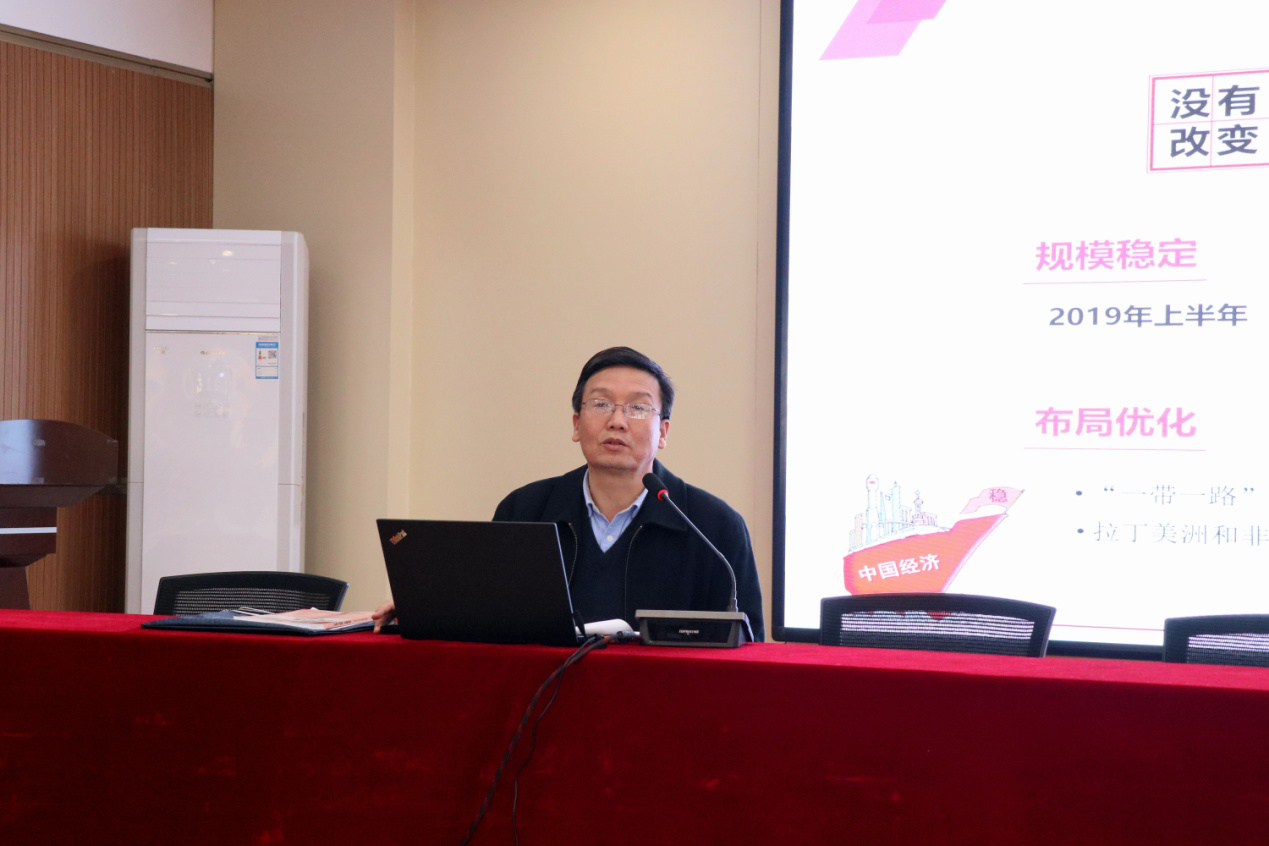 《中国经济行稳致远》这一专题,齐晓军从2019年前三季度国民经济运行情况讲起,结合第二届中国国际进口博览会和中美经贸摩擦事实,从总体平稳主要预期目标较好完成、稳中有进转型升级蹄疾步稳、稳中有变正确看待风险与挑战和长期向好我国发展仍处于重要战略机遇期四个方面,向员工们进行了深入细致的讲解。