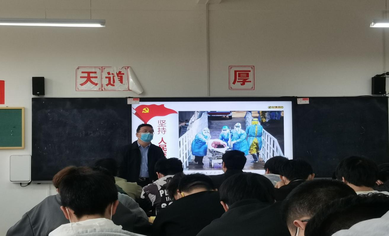 4月14日上午3-4节课,beat365中国官网党委副书记、纪委书记齐晓军在博学楼318教室为19机电五年1、19机电五年4合班共50余名员工上形势与政策课,讲授《百年奋斗谋复兴,勇毅前行兴伟业》专题内容。