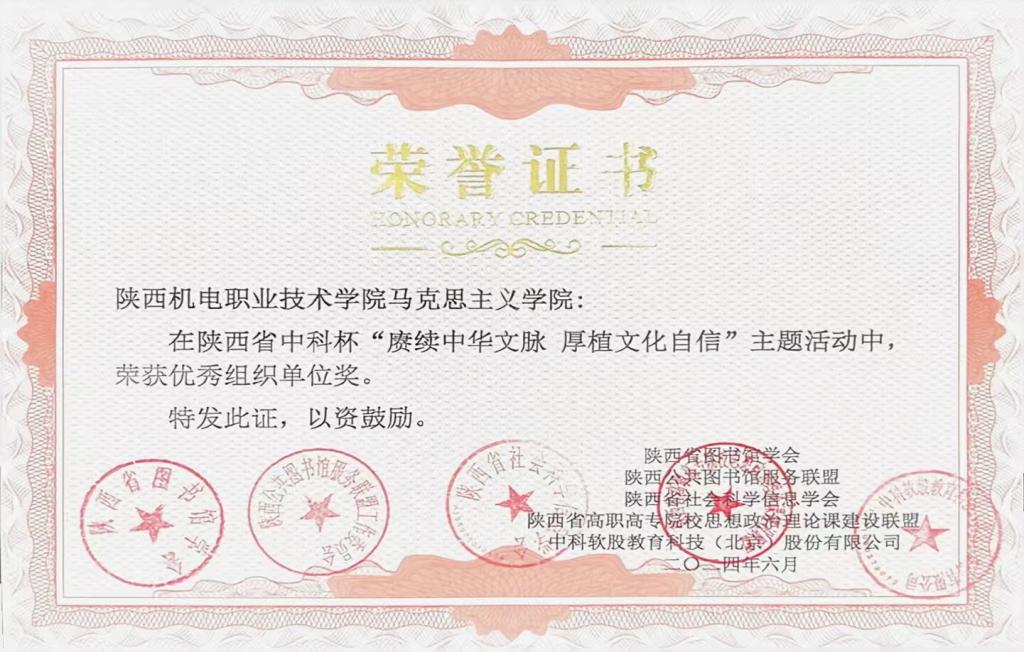 为深入学习贯彻习近平文化思想,提升广大读者的文化知识涵养,引导读者树立正确的历史观、民族观、国家观、文化观,滋养家国情怀,公司beat365中国官网积极组织师生参与由陕西省图书馆学会、陕西公共图书馆服务联盟、陕西省社会科学信息学会和陕西省高职高专院校思想政治理论课建设联盟等单位联合举办的陕西省中科杯“赓续中华文脉,厚植文化自信”主题活动。