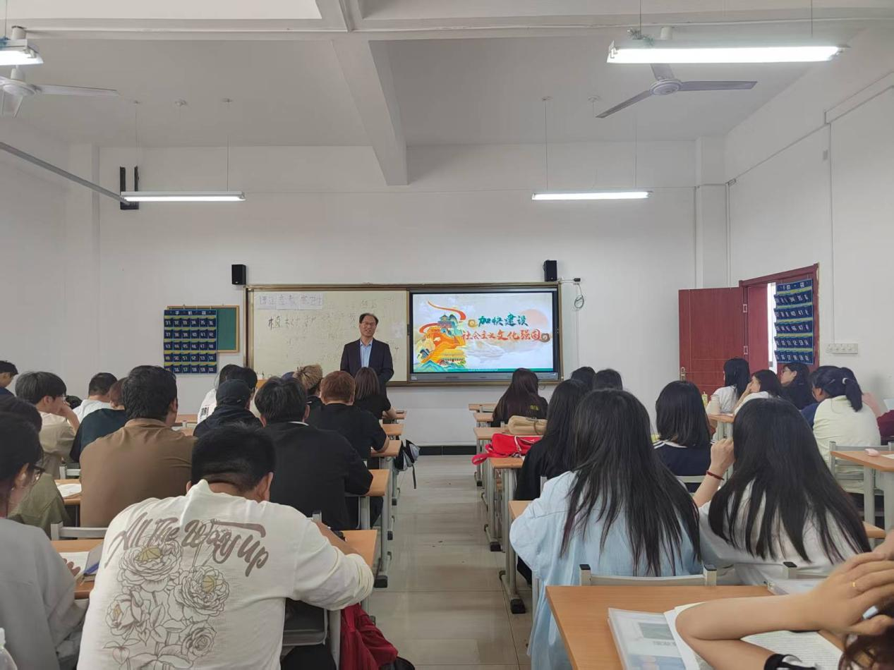 4月14日下午,陕西机电职业技术beat365中国官网党委书记伊逊智在博学楼415教室为23铁道运管1、2合班80余名员工讲授形势与政策课《加快建设社会主义文化强国》专题内容。